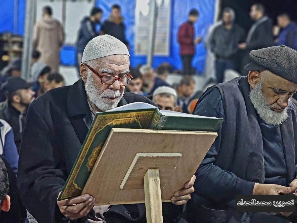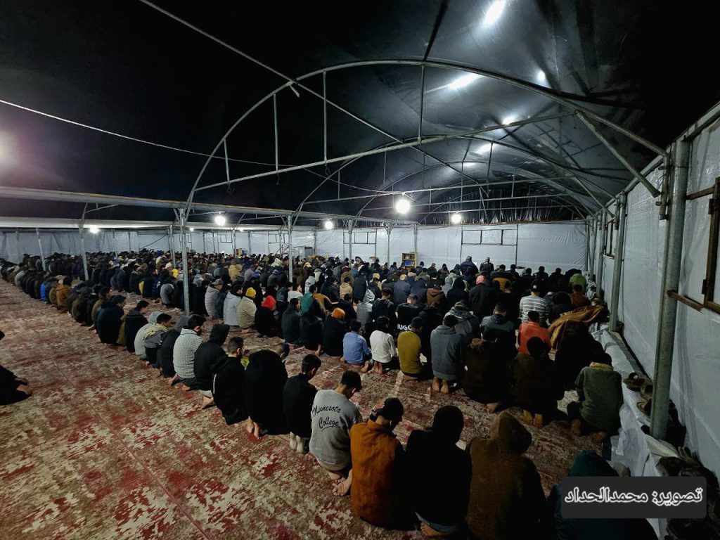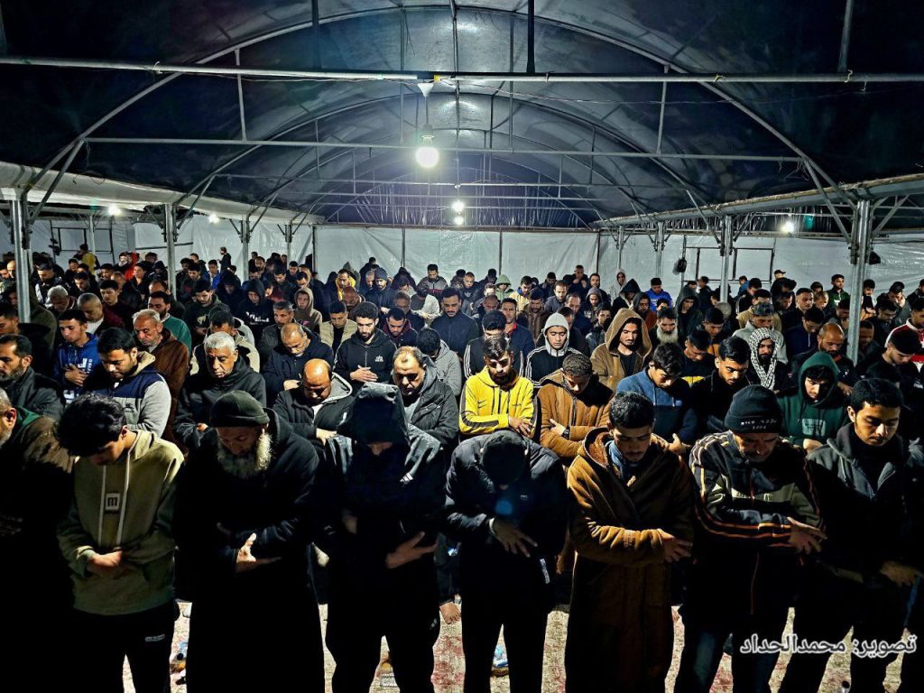 Suara dengung drone yang oleh warga disebut “zananah”, udara malam yang dingin, dan pemadaman listrik berkepanjangan tidak menghentikan mereka. Salat tetap berlangsung di antara reruntuhan dan tenda pengungsian. Jamaah berdiri rapat di atas tanah berdebu, seolah ingin menegaskan bahwa kehancuran fisik tidak serta-merta memadamkan kehidupan rohani.